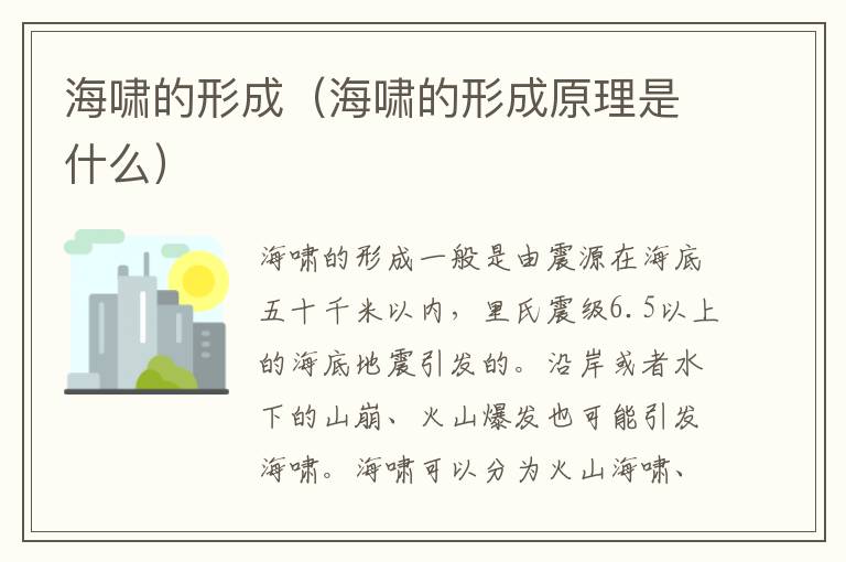 海啸的形成一般是由震源在海底五十千米以内,里氏震级6.5以上的海底地震引发的。沿岸或者水下的山崩、火山爆发也可能引发海啸。海啸可以分为火山海啸、地震海啸以及滑坡海啸。海啸多发区主要在阿拉斯加区域、夏威夷群岛、日本、菲律宾群岛等。