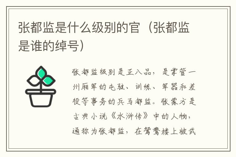 张都监级别是正八品,是掌管一州厢军的屯驻、训练、军器和差役等事务的兵马都监。张蒙方是古典小说《水浒传》中的人物,通称为张都监,在鸳鸯楼上被武松杀死。张蒙方,出自《水浒传》,孟州的兵马都监。因为姓氏相同与张团练结为兄弟,与张团练和蒋忠狼狈为奸欲加害武松,反而全被武松杀。