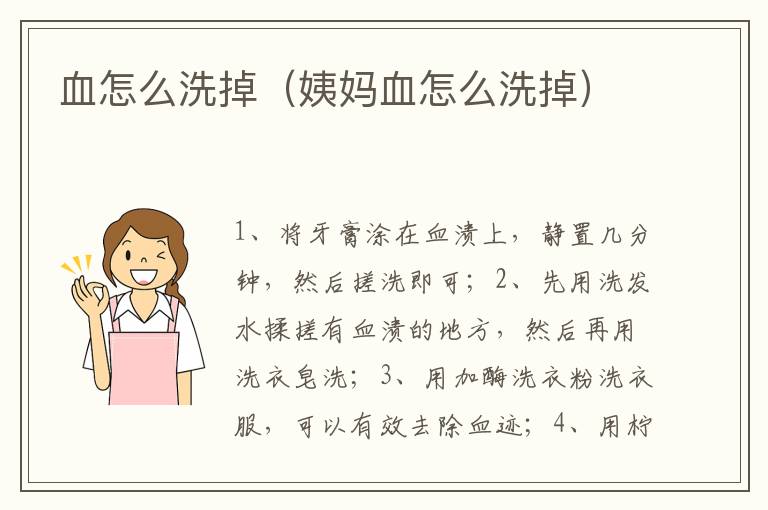 1、将牙膏涂在血渍上,静置几分钟,然后搓洗即可;2、先用洗发水揉搓有血渍的地方,然后再用洗衣皂洗;3、用加酶洗衣粉洗衣服,可以有效去除血迹;4、用柠檬水加盐水浸泡搓洗,可以有效去除衣物上的血迹。