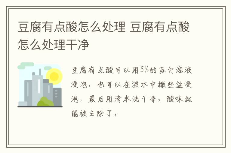 豆腐有点酸了可以用5%的苏打溶液浸泡。浸泡半个小时左右,将豆腐取出,用清水冲洗干净,酸味即可去除。