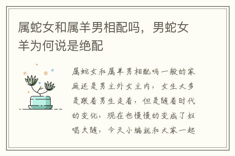 以上就是与属蛇女和属羊男相配吗相关内容,是关于生肖的分享。看完男蛇女羊为何说是绝配后,希望这对大家有所帮助!