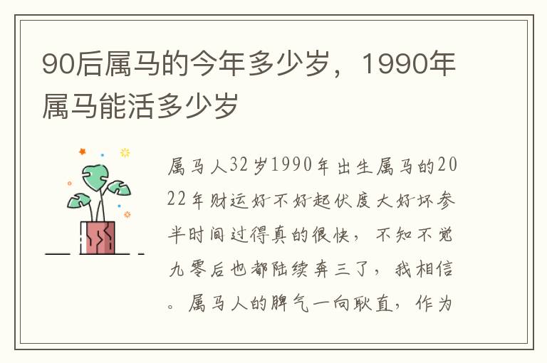 以上就是与90后属马的今年多少岁相关内容,是关于属马的分享。看完1990年属马能活多少岁后,希望这对大家有所帮助!