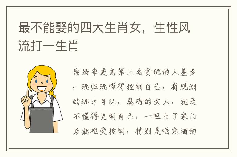 以上就是与最不能娶的四大生肖女相关内容,是关于生肖的分享。看完生性风流打一生肖后,希望这对大家有所帮助!