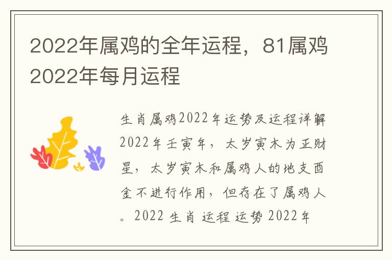 以上就是与2022年属鸡的全年运程相关内容,是关于生肖的分享。看完81属鸡2022年每月运程后,希望这对大家有所帮助!