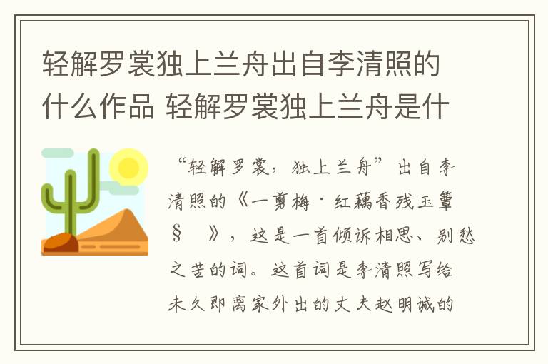 “轻解罗裳,独上兰舟”出自李清照的《一剪梅·红藕香残玉簟秋》,这是一首倾诉相思、别愁之苦的词。这首词是李清照写给未久即离家外出的丈夫赵明诚的,她诉说了自己独居生活的孤独寂寞,急切思念丈夫早日归来的心情。