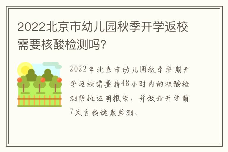 2022年秋季学期幼儿园开学返校需要持48小时内的核酸阴性检测报告证明。