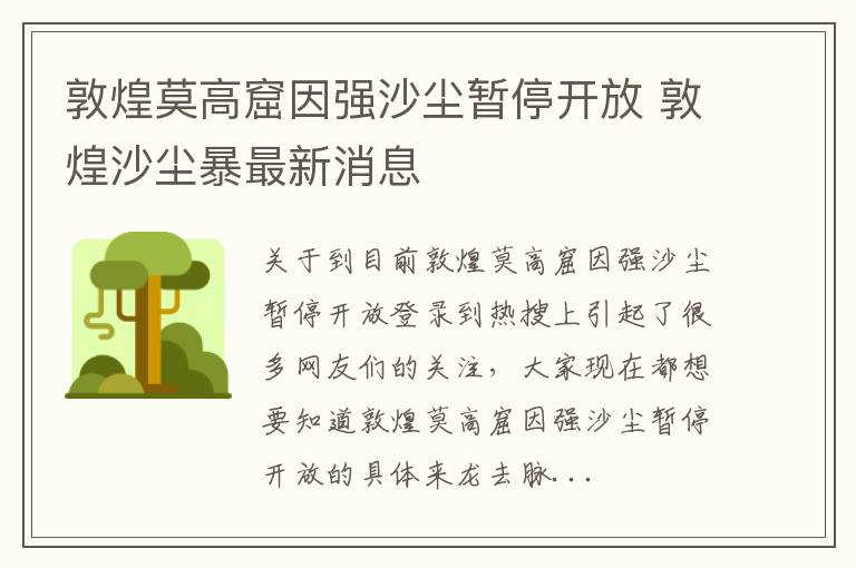 关于到目前敦煌莫高窟因强沙尘暂停开放登录到热搜上引起了很多网友们的关注,大家现在都想要知道敦煌莫高窟因强沙尘暂停开放的具体来龙去脉,那么小编今天也是抽空到网上去整理了一些与敦煌莫高窟因强沙尘暂停开放相关的信息,那么如果大家感兴趣的话可以接着往下看哦。(以下内容来自于:深港在线)