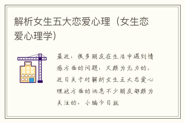 最近,很多朋友在生活中遇到情感方面的问题,又颇为无力的。近日关于对解析女生五大恋爱心理这方面的讯息不少朋友都颇为关注的,小编今日就解析女生五大恋爱心理整理了一些信息,希望对关注这方面信息的朋友有所帮助.