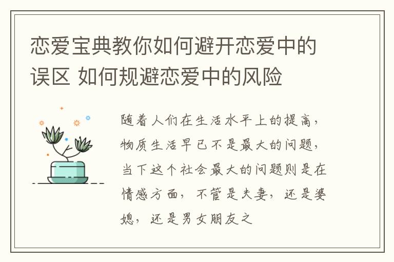 随着人们在生活水平上的提高,物质生活早已不是最大的问题,当下这个社会最大的问题则是在情感方面,不管是夫妻,还是婆媳,还是男女朋友之间都存在着很大的矛盾纠结问题点,对于多数人来说是根本无法处理好这方面的问题,那么今天小编就为大家分享一些关于恋爱宝典教你如何避开恋爱中的误区方面的信息内容,让大家能够更懂得如何去处理这些情感方面的问题。