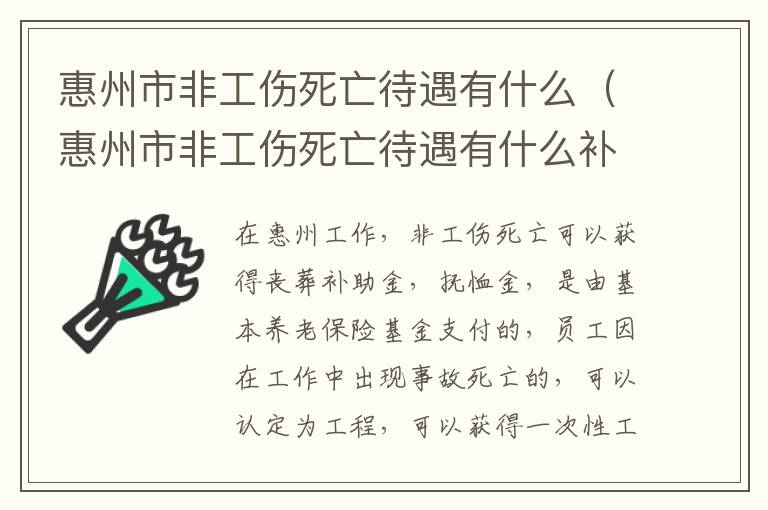 非工伤死亡赔偿的待遇是:丧葬费用本企业职工平均工资2个月;一次性救济金直系亲属一人的,为死者本人工资6个月;两人为本人工资的9个月;三人及以上,为死者本人工资的12个月工资。