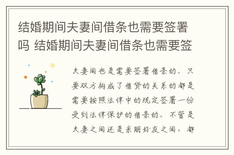 夫妻间也是需要签署借条的。借条,是表明债权债务关系的书面凭证,一般由欠款人书写并签章,表明欠款人已经欠下借款人借条注明金额的债务。欠条和借条的性质是不一样的,它们形成的原因不同,借条主要是因借贷而产生,欠款则可能是因为买卖、租赁、利息等原因产生。