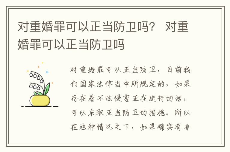 在我们日常生活当中,目前我们国家对重婚罪有非常明确的规定的,一般情况之下,如果存在着有配偶,但是却和他人再次的登记结婚,曾在重婚这种情况的话,需要按照有期徒刑来进行一定的判决,当然了,如果在重婚过程当中存在着一些不法侵害,导致身体受到非常严重伤害的状况之下,是可以采取正当防卫措施。