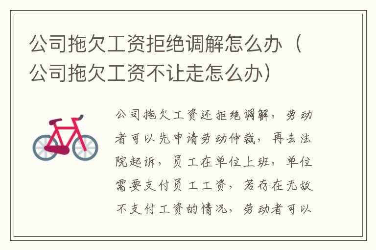 若公司拒绝调解,可以申请劳动仲裁,老板不给员工工资,员工可以先跟老板协商要求,用人单位在规定时间内支付工资,如果用人单位还是不给,可以携带材料去劳动行政部门投诉,由该部门的用人单位进行处罚,还可以申请劳动仲裁。