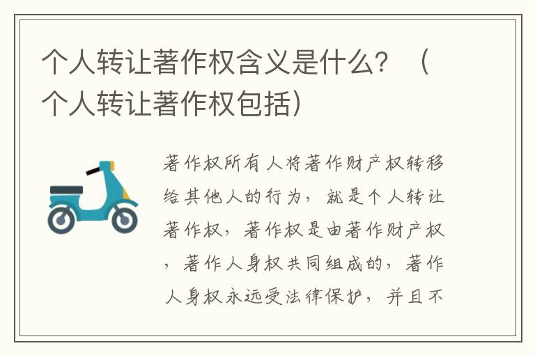 著作权的转让,是指著作权作为一项财产权,包括复制权、发行权、展览权、公开表演权、播放权、改编权、翻译权、汇编权、以及整理权和注释权等或者是其中的任何一项或几项权能,从一个民事主体合法的转移到另一个民事主体支配下的行为。其法律后果是,著作权一经转让,出让人便丧失了该权利。因此,确切地说,著作权的转让是指著作财产权的转让。