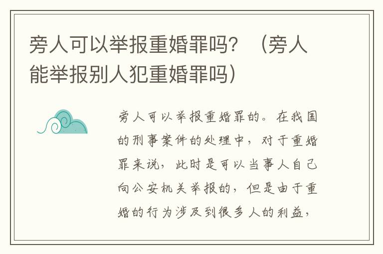 公民发现有犯罪行为的,是可以向公安机关报案的,所以其他人发现有重婚行为的,可以向公安机关举报。依照《刑事诉讼法》第十六条的规定,曾将重婚案件列为不需要进行侦查的轻微的刑事案件,规定由人民法院直接受理。对于被害人不控告,而由人民群众、社会团体或有关单位提出控告的重婚案件,由人民检察院审查决定应否对该案件提起公诉。