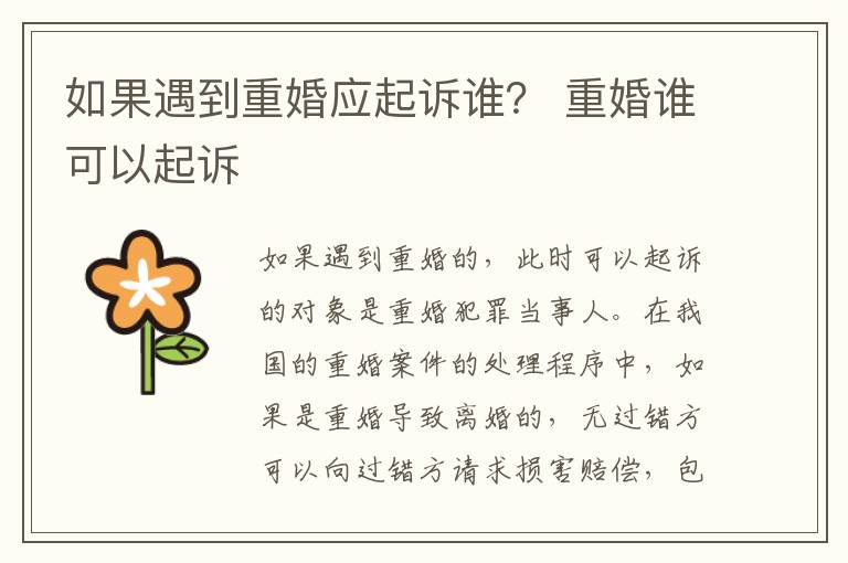 重婚罪起诉的对象是重婚犯罪当事人,也就是有配偶和他人结婚一方或第三者,这两个人都是重婚罪的犯罪对象。起诉重婚罪,需要受害人自诉,收集好相关证据材料后,可以去重婚发生地的法院立案。同时,受害人也能提出离婚诉讼并要求赔偿。