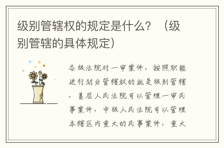 级别管辖是指审判管辖中的一种,亦称为审级管辖、事务管辖,基层人民法院,中级人民法院,高级人民法院可以共同管辖一审民事案件,一般的民事案件,社会影响力较小的,需要由基层人民法院管辖,重大的涉外案件,本辖区内有重大影响的案子,由中级人民法院管辖。