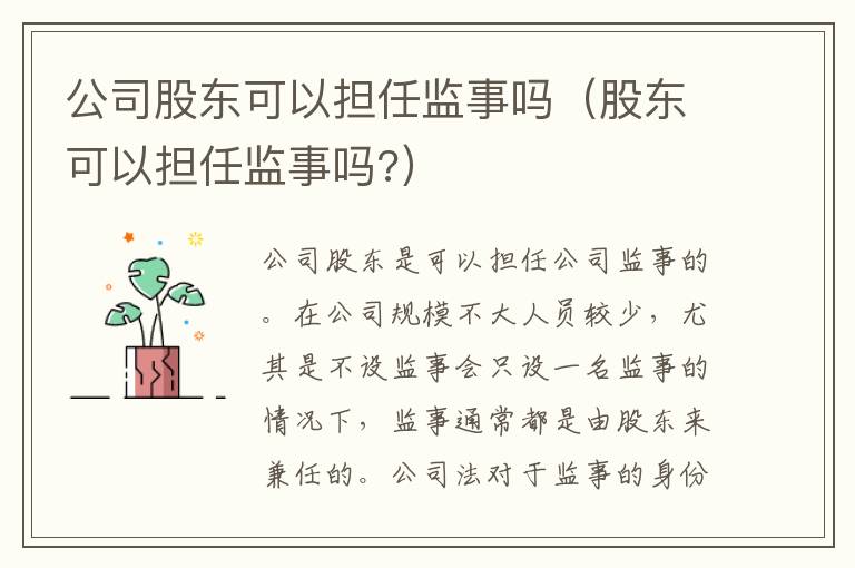 公司股东是可以担任公司监事的。监事的产生是由股东决定的,如果公司股东是企业法人,那么这家作为股东的公司应当依据法律和 公司章程 的规定确定一名人选,以派往你公司担任监事。 但监事不一定是股东。