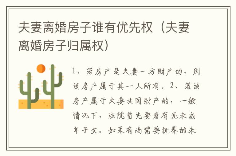 2、若该房产属于夫妻共同财产的,一般情况下,法院首先要看有无未成年子女。如果有尚需要抚养的未成年子女,孩子归谁房子就判给谁。若不存在上述情形,那么房子可能会优先判给产权方或者无过错方。