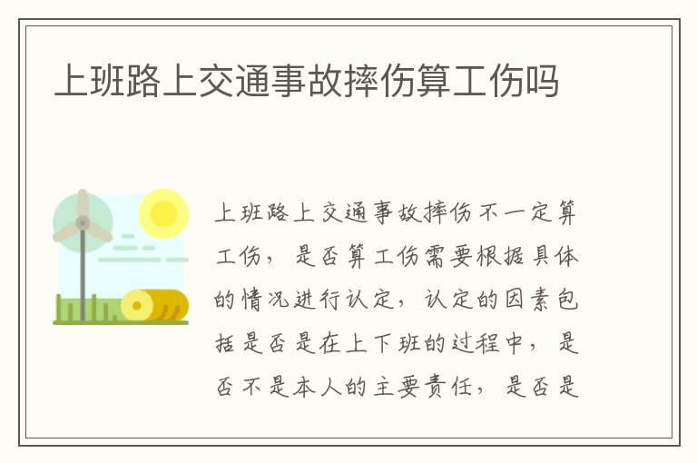 交通事故是否算工伤还需要进行是否是上下班途中发生的,并且是否不是本人的主要责任进行认定,必须是在合理的时间和合理的路线上上下班,伤害必须是由城市交通轨道或交通事故造成的伤害,事故应该是非本人责任。