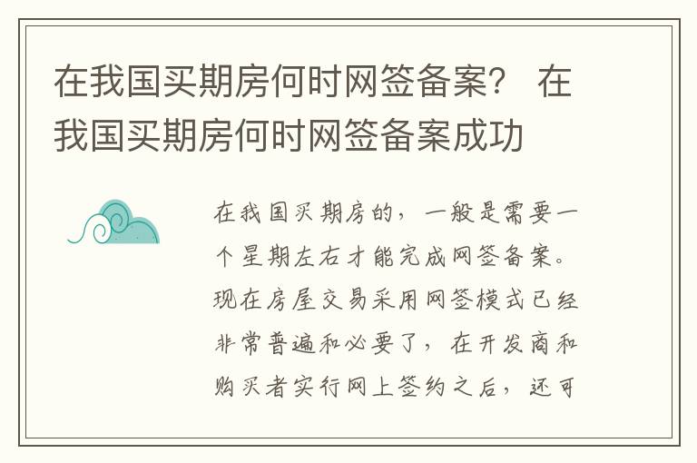 买房网签后备案的时间,一般在一周左右,具体情况可以咨询工作人员,网签是网上签约的简称,常见于房地产交易领域,指交易双方签订合同后,到房地产相关部门进行备案,形成网签号并在网上公布,用户可以通过网签号在网上进行查询。在电子商务领域又称为电子缔约、合同网签。网上签约的程序为:交易双方当事人根据网上公示的商品房定金协议或买卖合同文本协商拟定相关条款———由房地产开发企业通过网上签约系统,打印经双方确认的协议或合同———双方当事人签字(盖章)———在电子楼盘表上注明该商品房已被预订或签约。