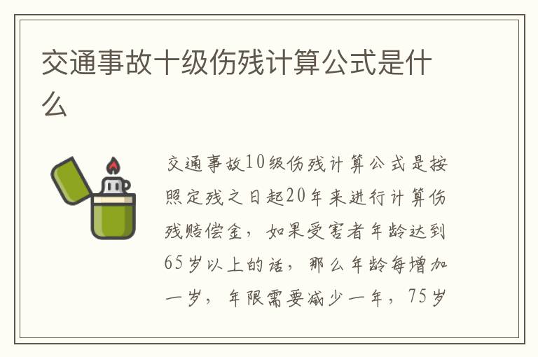 1、交通事故造成10级伤残的,伤残赔偿金按照受诉法院所在地上一年度城镇居民人均可支配收入或者农村居民人均纯收入标准,自定残之日起按二十年计算。65岁以上的,年龄每增加一岁减少一年。75岁以上的,按五年计算。