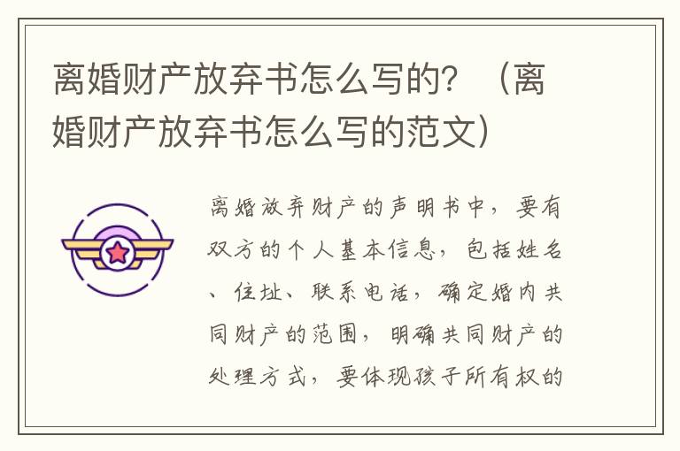 1、离婚财产分割协议首先应该有当事人及其婚姻的基本情况。姓名、性别、出生年月日、民族、籍贯、工作单位、职业、住址、身份证号、时间、生育子女时间个数、离婚原因。