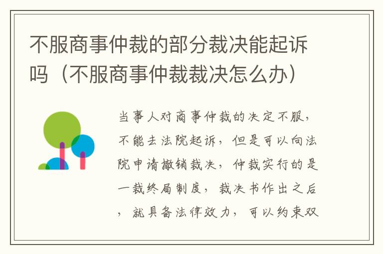 不服商事仲裁的部分裁决,不能起诉,申请执行仲裁裁决时,必须在法律规定的期限内,没有正当理由,逾期提出申请执行的,人民法院会不予受理。当事人一方或双方是公民的,从仲裁裁决书履行期限的最后一日开始计算,申请仲裁裁决执行的期限是一年。