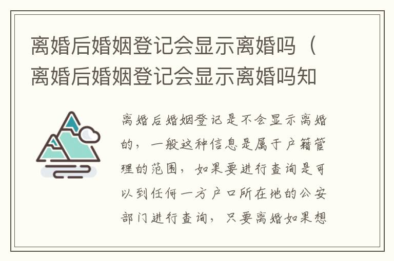综合上面所说的,离婚就代表着双方解除了婚姻关系,对于户口的信息就会变为离婚的状态,如果要查询是可以直接到当地的公安部门查,如果是婚姻登记机关一般是无法进行显示的,所以,在处理的时候就可以多咨询一下,这样才能查询得到。