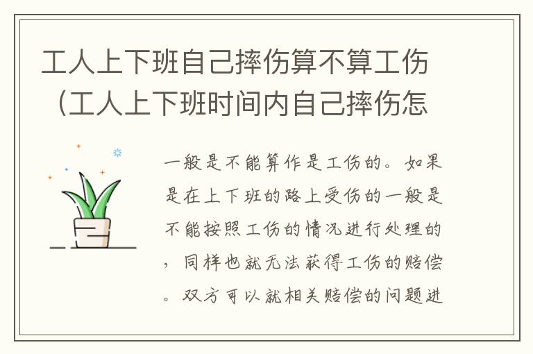 工人上下班自己摔伤的情形一般是不能按照工伤进行处理的,如果双方就赔偿的问题无法达成一致的意见可以选择收集相关的证据材料到劳动局申请劳动仲裁解决,同时也可以携带相关的治疗资料到相关部门进行详细的伤情鉴定,双方都需要严格的按照工伤鉴定报告去执行。
