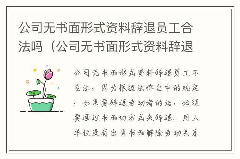 公司无书面形式资料辞退员工不合法,因为根据法律当中的规定,如果要辞退劳动者的话,必须要通过书面的方式来辞退。公司辞退员工必须要有辞退信,通过口头通知的不具有法律效力。
