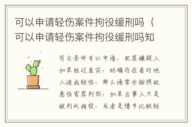因此如果是一个轻伤案件,最终的判刑结果是对当事人处拘役,那么就满足了缓刑的一个条件,如果是伤害他人在三年以上的有期徒刑,就不能够再申请缓刑了。如果当事人是对别人造成的轻伤情节不是特别严重,并且他的确是存在着一定的悔改表现,也是可以申请的,具体是否通过就要看法院的最终决定。