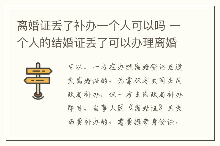 可以。一方在办理离婚登记后遗失离婚证的,无需双方共同去民政局补办,仅一方去民政局补办即可。当事人因《离婚证》丢失而要补办的,需要携带身份证、户口本到原办理婚姻登记的机关或者一方当事人常住户口所在地的婚姻登记机关申请补领。