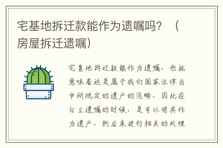 宅基地拆迁款能作为遗嘱,农村宅基地房屋的动迁补偿一般分为房屋补偿和宅基地使用权补偿。地上物的补偿,应当归属房屋权利人。房屋原权利人已经死亡的,动迁补偿款可依继承关系进行处理。