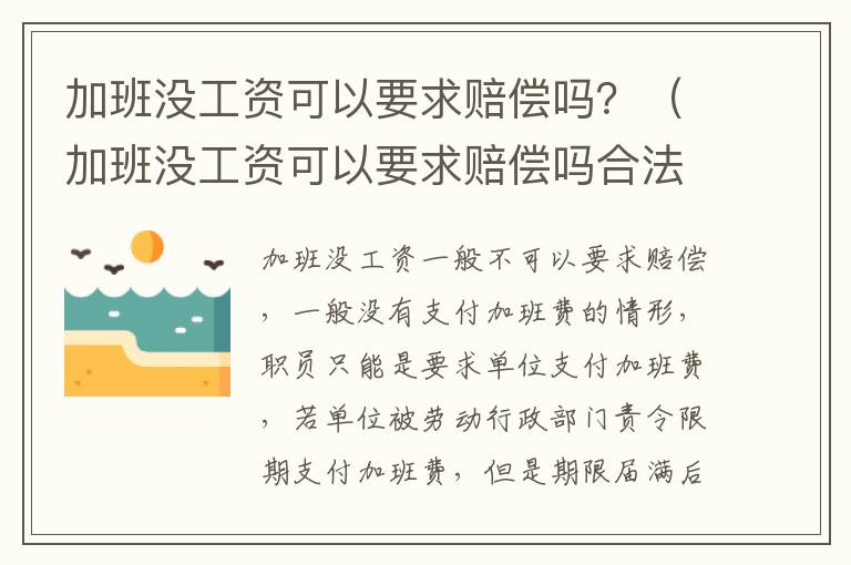 1、加班没工资一般不可以要求赔偿,此种情形出现的时候,没有获得加班费的职员可以要求支付加班工资。