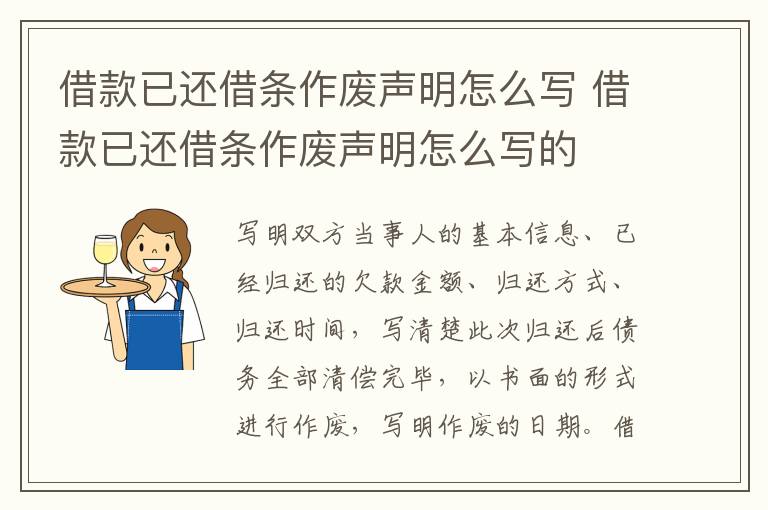 借条是证明双方当事人存在借贷关系的证据,在借条中应当体现借款金额、借款时间,债务人在约定期限内归还欠款,债权人应当写借条作废声明,证明双方的借贷关系结束,借款作废声明是具有法律效应的,双方产生纠纷时,债权人可以凭借作废声明依法维护自己的合法权益。