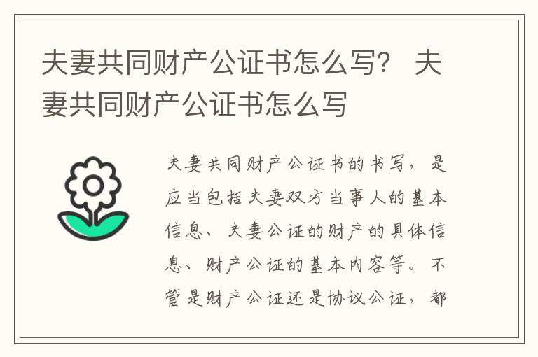 在我国的夫妻财产公证的规定中,财产公证书需要写明财产的数量、范围、种类等,并对归属作出明确规定,同时,个人信息也应如实写明,一般情况下,最后的签字是由公证员审查合格后才进行的。