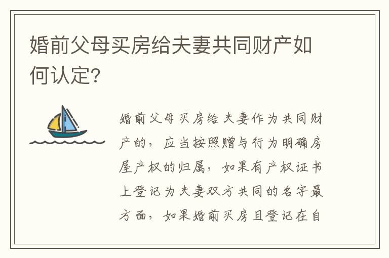 综上所述,婚前父母赠与财产属于子女一方的财产,除非登记在夫妻双方共同名下,或者明确赠与行为是针对夫妻双方,否则经人民法院认定情况属实的属于子女一方个人房产,夫妻离婚的时候不用按照夫妻共同房产进行分割处理。
