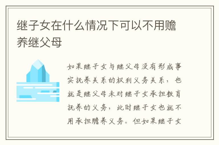 如果继子女与继父母没有形成事实抚养关系的权利义务关系,也就是继父母未对继子女承担教育抚养的义务,此时继子女也就不用承担赡养义务。但如果继子女与继父母形成事实抚养关系的权利义务关系,继子女需要承担赡养义务。