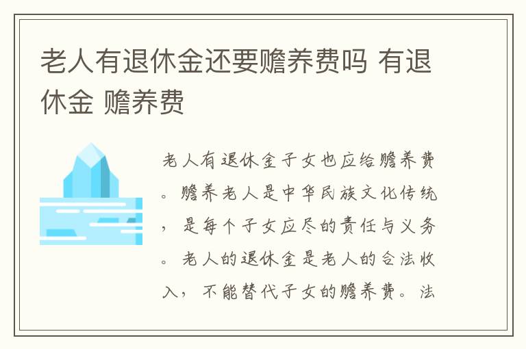 一般要是老人有工资的话,至少有一定的收入来源,生活不至于过不下去。但是老人有工资,并不代表就可以不给赡养费。因为在老人有工资的情况下,也有可能出现生活困难的情况,此时作为成年且有经济能力的子女,就应当支付老人一定的赡养费。赡养费的多少根据赡养人的实际能力,由赡养人与被赡养人协商解决,如果不能协商解决的,则由人民法院根据当地的经济水平,被赡养人的实际需求,赡养人的经济能力综合认定。