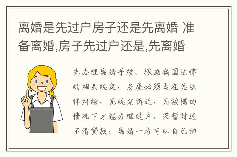 如果是这种情况,则需要还清银行贷款。若暂时还不清贷款,离婚一方可以自己的名义向另一家银行申请办理转按揭,将抵押在银行的房产证解押出来后去办过户。但由于转按揭手续非常麻烦,目前多数银行已经停办此项业务。为此,银行给出两种建议,其一即通过正常买卖流程过户,重新缴纳契税、评估担保费用;其二是到公证处办理房产公证后,一方继续使用原按揭人的银行卡缴纳贷款。一般采纳第二种方式的居民较多。