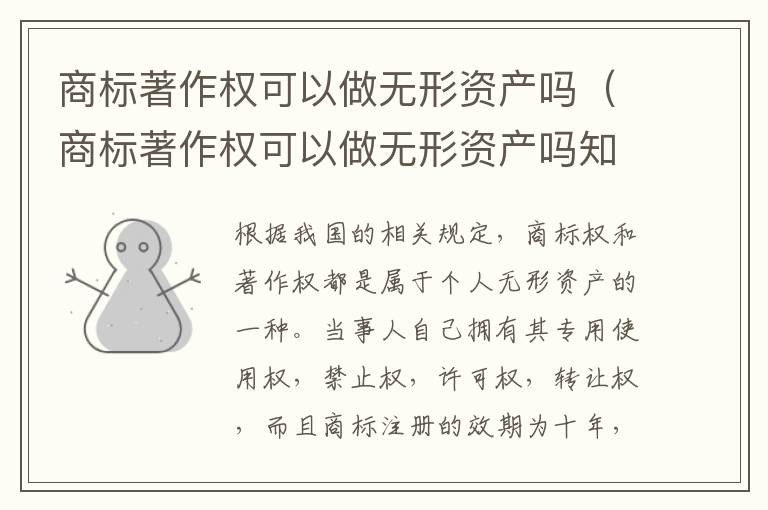 综上所述,无形资产是指企业拥有或者控制的没有实物形态的可辨认非货币性资产。无形资产包括专利权、非专利技术、商标权、著作权、土地使用权、特许权等。 所以商标权当然属于无形资产,归个人所拥有的。