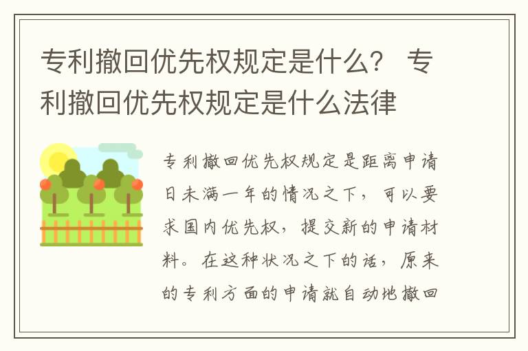 专利撤回优先权规定是距离申请日未满一年的情况之下,可以要求国内优先权,提交新的申请材料。如果距离申请日未满一年,则可要求国内优先权提交新的申请文件,同时原先的专利申请自动撤回,不会影响新的申请的新颖性。已被视为撤回的专利申请仍可以作为要求优先权的在先申请。但在后申请必须在优先权期限内提出,优先权期限是指申请人自发明或者实用新型在国内第一次提出专利申请之日起12个月内。