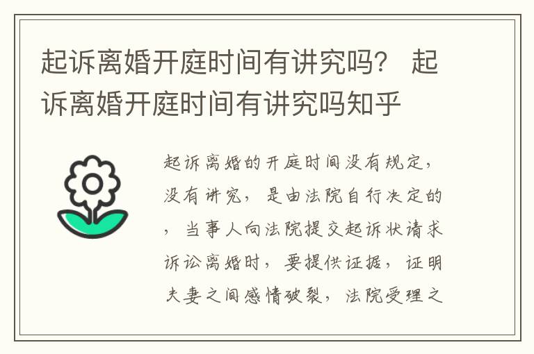 起诉离婚开庭时间没有讲究,采用诉讼的方式办离婚手续,要先选择有管辖权的法院,携在身份证,户口本,结婚证,起诉书,法院提出离婚的申请,法院立案之后会先进行调解,如果调解不成,会开庭审理此案件,并下达判决书。