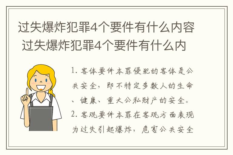 (1)行为人实施了过失引起爆炸的行为。如果爆炸不是由于行为人的过失行为引起的,而是由于自然原因或者其他不能预见、不可抗拒的原因引起的,则不成立过失爆炸罪。