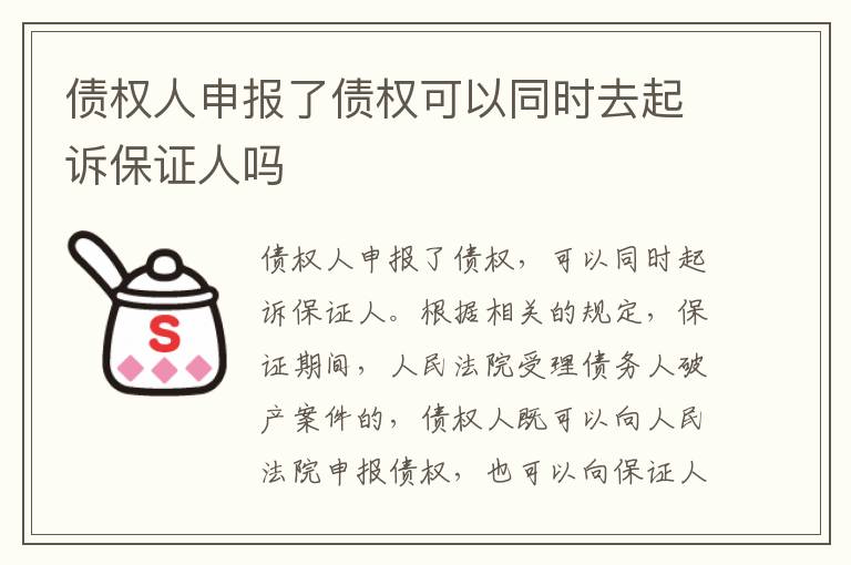 债权人申报了债权,可以同时起诉保证人。根据相关的规定,保证期间,人民法院受理债务人破产案件的,债权人既可以向人民法院申报债权,也可以向保证人主张权利。债权人申报债权后在破产程序中未受清偿的部分,保证人