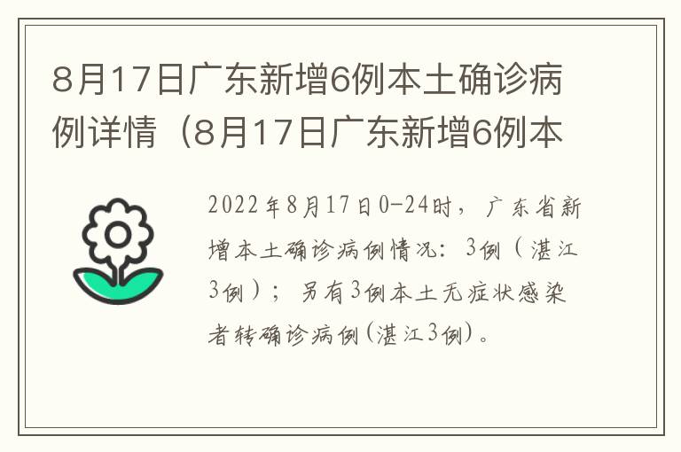 8月17日0-24时,广东省新增本土确诊病例3例(湛江3例);新增本土无症状感染者2例(广州1例,东莞1例);另有3例本土无症状感染者转确诊病例(湛江3例)。