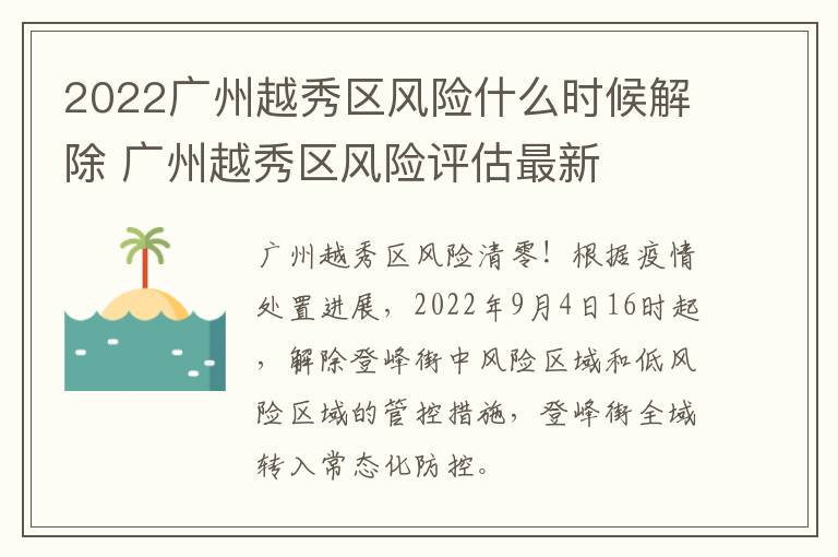 据广州越秀发布消息,根据疫情处置进展,经专家研判,2022年9月4日16时起,解除登峰街中风险区域和低风险区域的管控措施,登峰街全域转入常态化防控。