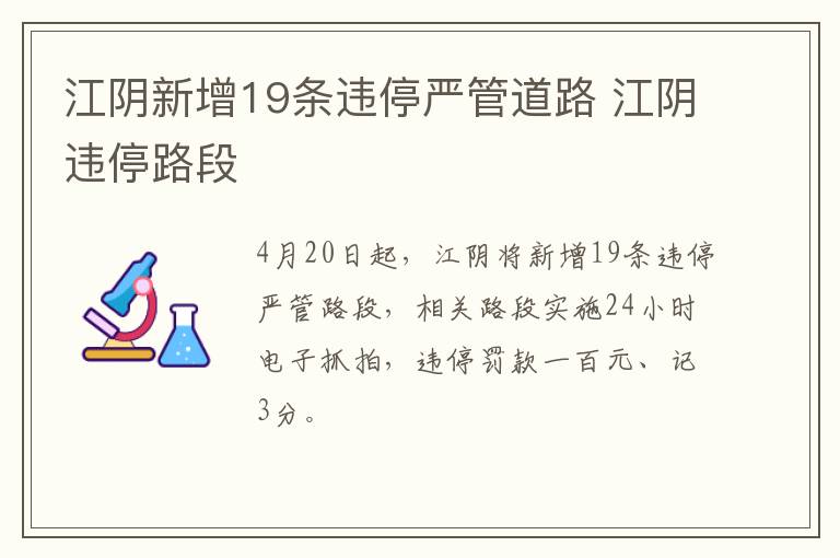为进一步提高江阴道路通行能力,确保市民文明安全出行,江阴市交警大队正式发布通告,4月20日起,江阴将新增19条违停严管路段,相关路段实施24小时电子抓拍,违停罚款一百元、记3分。
