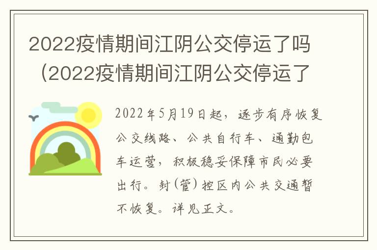 2022年5月19日起,逐步有序恢复公交线路、公共自行车、通勤包车运营,积极稳妥保障市民必要出行。封(管)控区内公共交通暂不恢复。